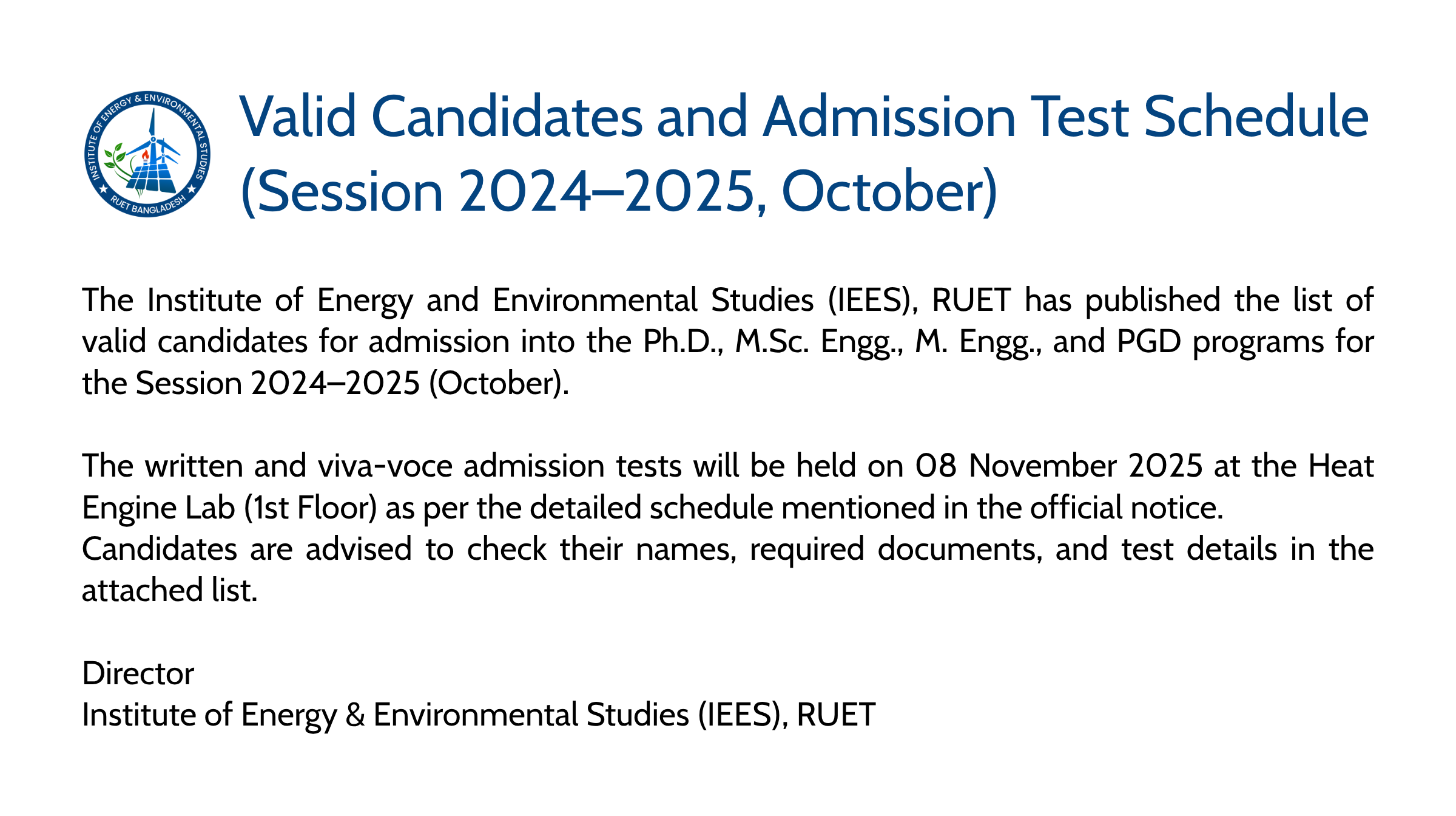 The Institute of Energy and Environmental Studies (IEES), RUET has published the list of valid candidates for admission into the Ph.D., M.Sc. Engg., M. Engg., and PGD programs for the Session 2024–2025 (October).