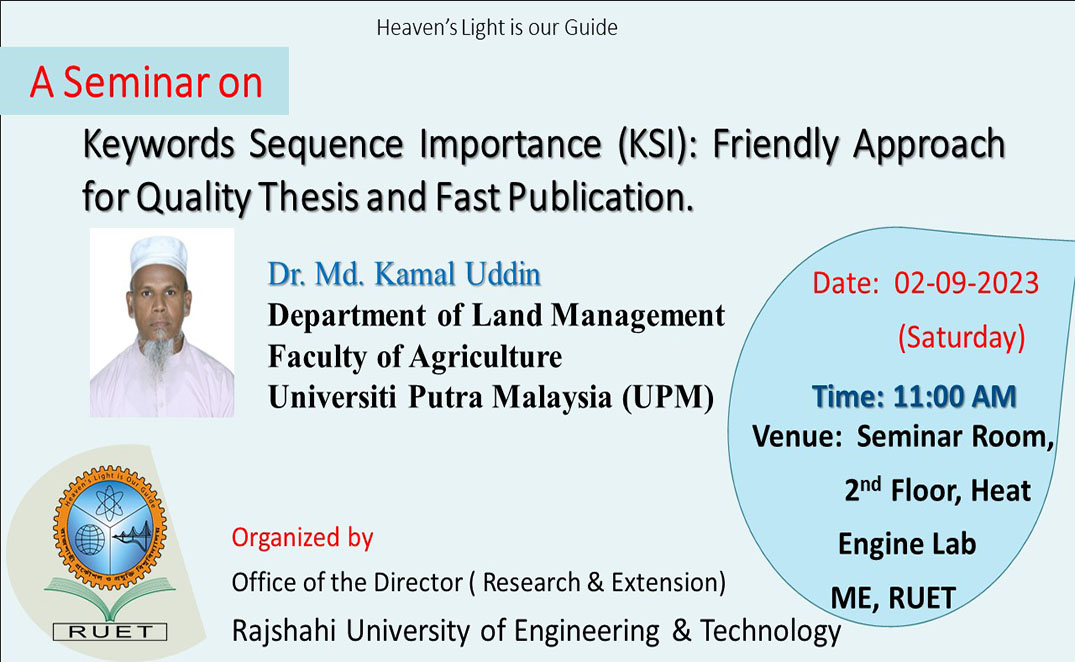 A seminar on Quality Thesis and Fast Publication was held at the ME Dept. yesterday at 11 AM, ME seminar room. Dr. Md. Kamal Uddin from Malaysia was physically present as the speaker at the seminar. Prof. Dr. Engr. Md. Jahangir Alam, VC of RUET was present as the chief guest and also delivered the preliminary speech. A significant number of faculty members of RUET were present as the audience. The program ended around 1:30 p.m. with a vote of thanks.
