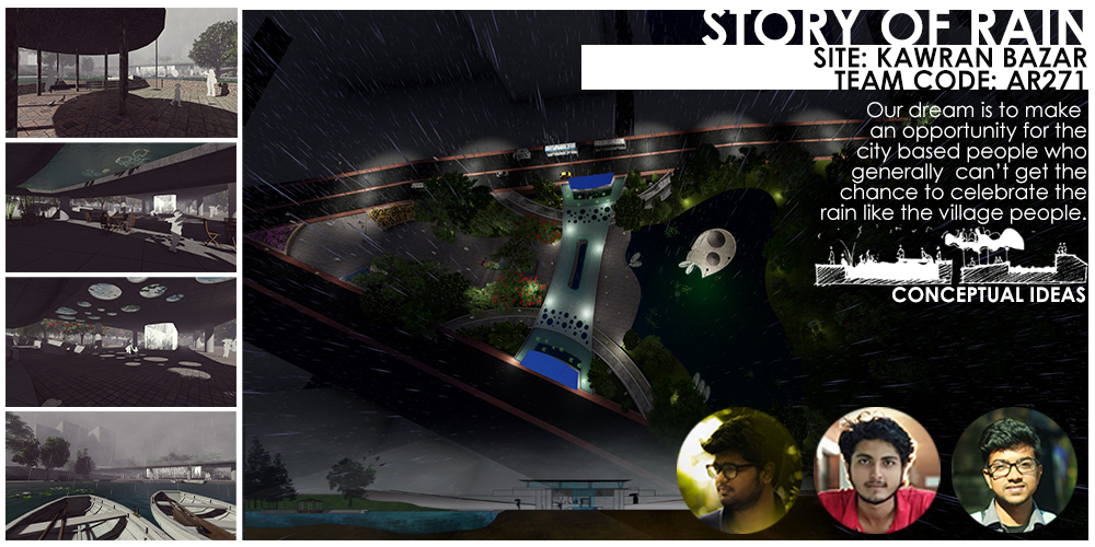 We want to transform the burden into happiness through our design. Our proposed site is a part of “PANTHAKUNJA” (an existing park besides the road of KARWAN BAZAR). We propose a change in a small portion of the park to experience the story of rain. We wanted to design a space where people can enjoy the flavor of rain, a space to feel the existence of himself, a place which connects the earth, water, soul of human being -with the rain, a place of relaxation in the busy life of city people.