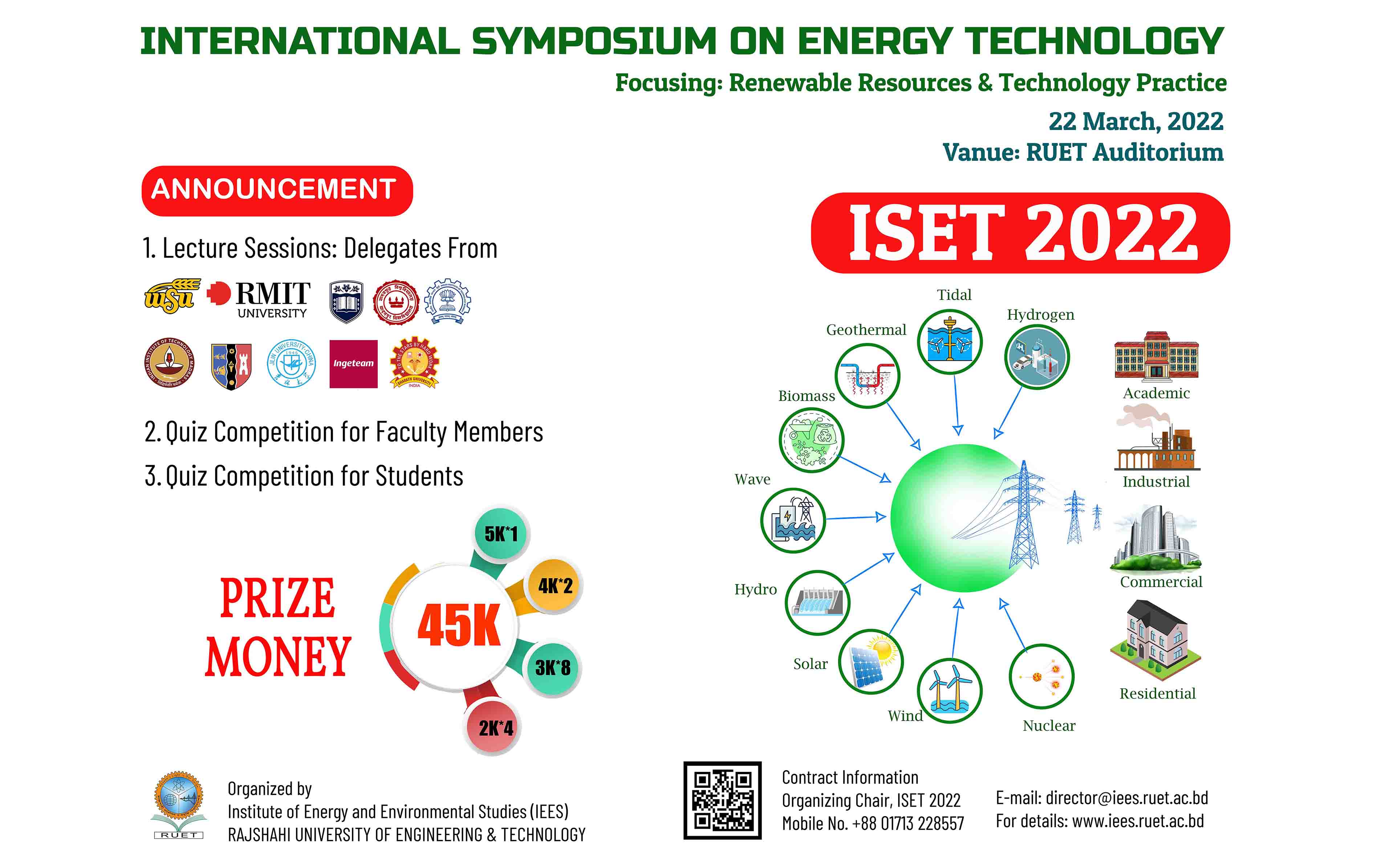 It gives us immense pleasure to inform you that the Institute of Energy and Environmental Studies (IEES) is going to organize an International Symposium on Energy Technology (ISET 2022) focusing: Renewable Energy Resources & Technology Practice on 22 March 2022.